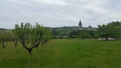 Market day in Castres. But we had already done as much shopping as we could carry, so we settled for a stop at the bakery before heading along the Agoût river and out of town. Today's walk took us through pretty farmlands and villages to Dourgne, where we are the guests of the nuns at Saint-Scholastique, a Benedictine convent.