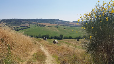After leaving San Quirico, the trail follows the road toward Pienza for a short way, then turns off on a gravel road to Agriturismo La Buca, where it becomes a grassy path through the wheat fields and then a muddy path through the trees - ah, shade!!! But the cool, damp woods soon give way to more wheat fields and the beautiful curves for which the Val d'Orcia is famous. The trail passes right by the chapel of Vitaleta, surrounded by cypress trees, an iconic image captured in every season of the year on calendars and postcards sold all over Tuscany. From close up, however, it's harder to get a good picture than from far away!