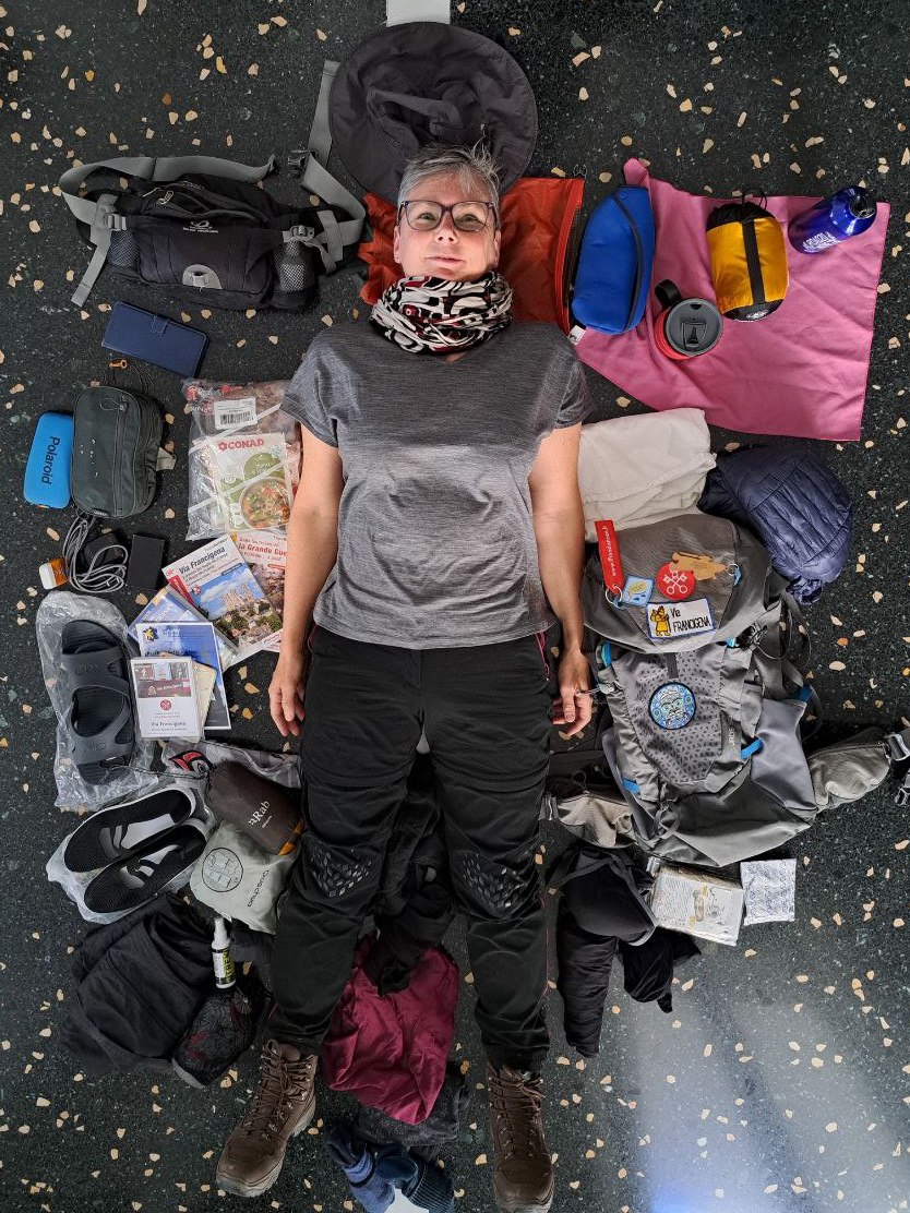 • in waist pack: Spork, pocket knife, mini-flashlight, whistle, phone, charger & cable, power bank & cable, guidebooks & information on the trail, pilgrim credential, notebook, wallet, bandana, small water bottle, pandemic supplies: face masks & sanitising gel